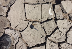 Modern mud cracks in a sump pond (polygons about 12 inches across)