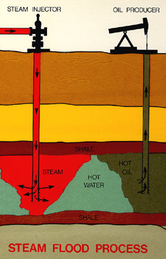 A little known fact is that the southern San Joaquin Valley, and Kern County in particular, produces a tremendous amount of electricity through a process called steam cogeneration. Because about two-thirds of the oil produced in California is "heavy" (in other words, too thick and viscous to flow on its own), steam is pumped into the ground to heat the oil and make it behave more like water and less like molasses. Thus, steam injection makes the oil more mobile and enables it to flow into wells where it can be produced.